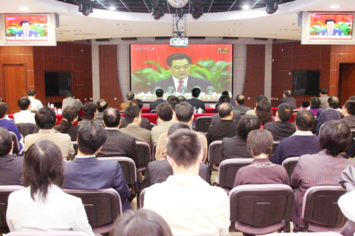 雖然因?yàn)槿藛T太多而略顯擁擠,但整個(gè)會(huì)場(chǎng)卻非常安靜,就連每逢會(huì)議難免嗡嗡作響的手機(jī)似乎也絕了聲。大家都在認(rèn)真地傾聽(tīng),有的詳細(xì)地做著記錄,有的還時(shí)不時(shí)地將身子輕輕探起,生怕錯(cuò)過(guò)電視里傳出的只言片語(yǔ)……10月15日上午,中核集團(tuán)公司黨組成員、副總經(jīng)理孫又奇,黨組成員王森,以及老領(lǐng)導(dǎo)趙宏、李忠良、錢(qián)福源等與集團(tuán)公司總部、檔案館、金原鈾業(yè)公司、新聞宣傳中心、二二一局的干部職工一起收看了中共十七大開(kāi)幕式的現(xiàn)場(chǎng)直播,聆聽(tīng)了胡錦濤總書(shū)記所作的報(bào)告。
